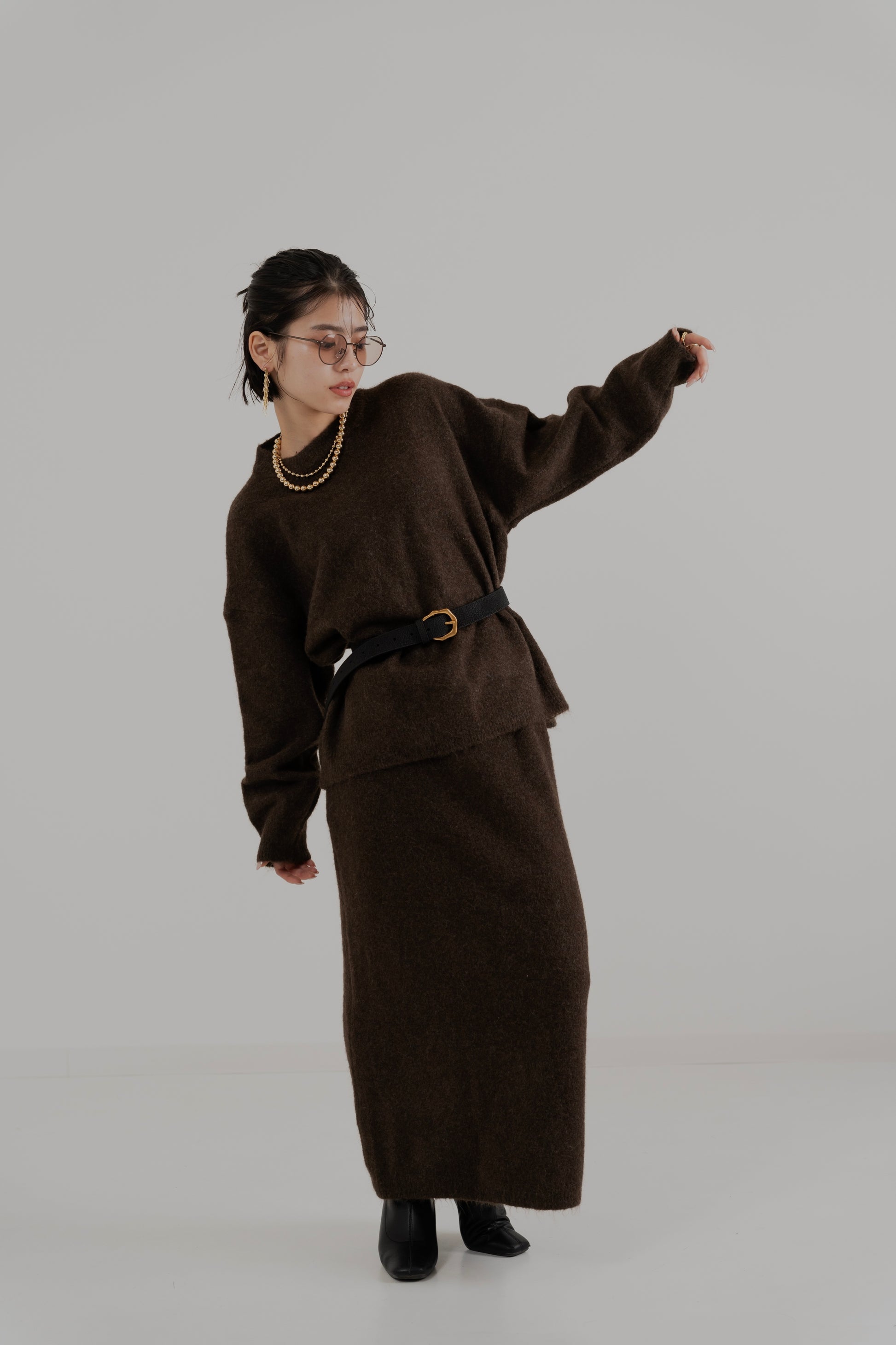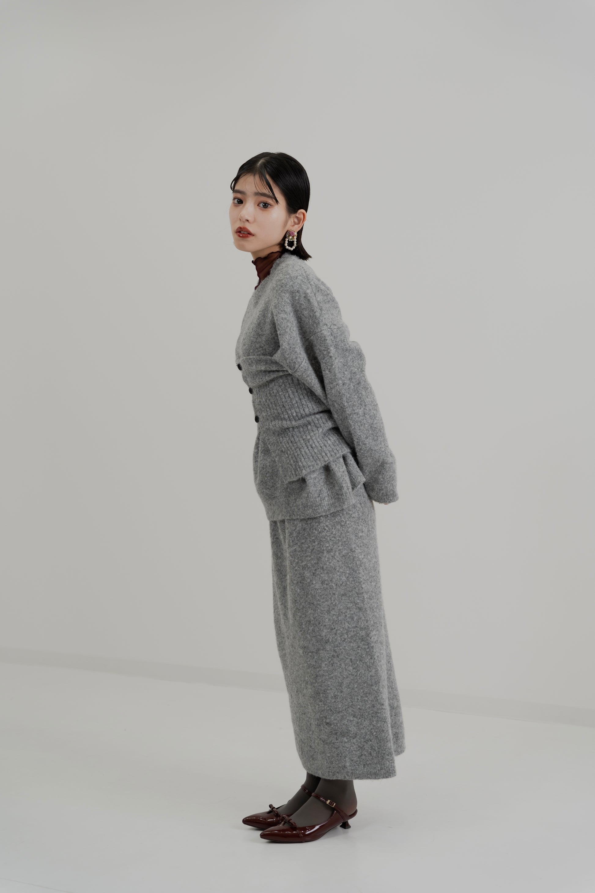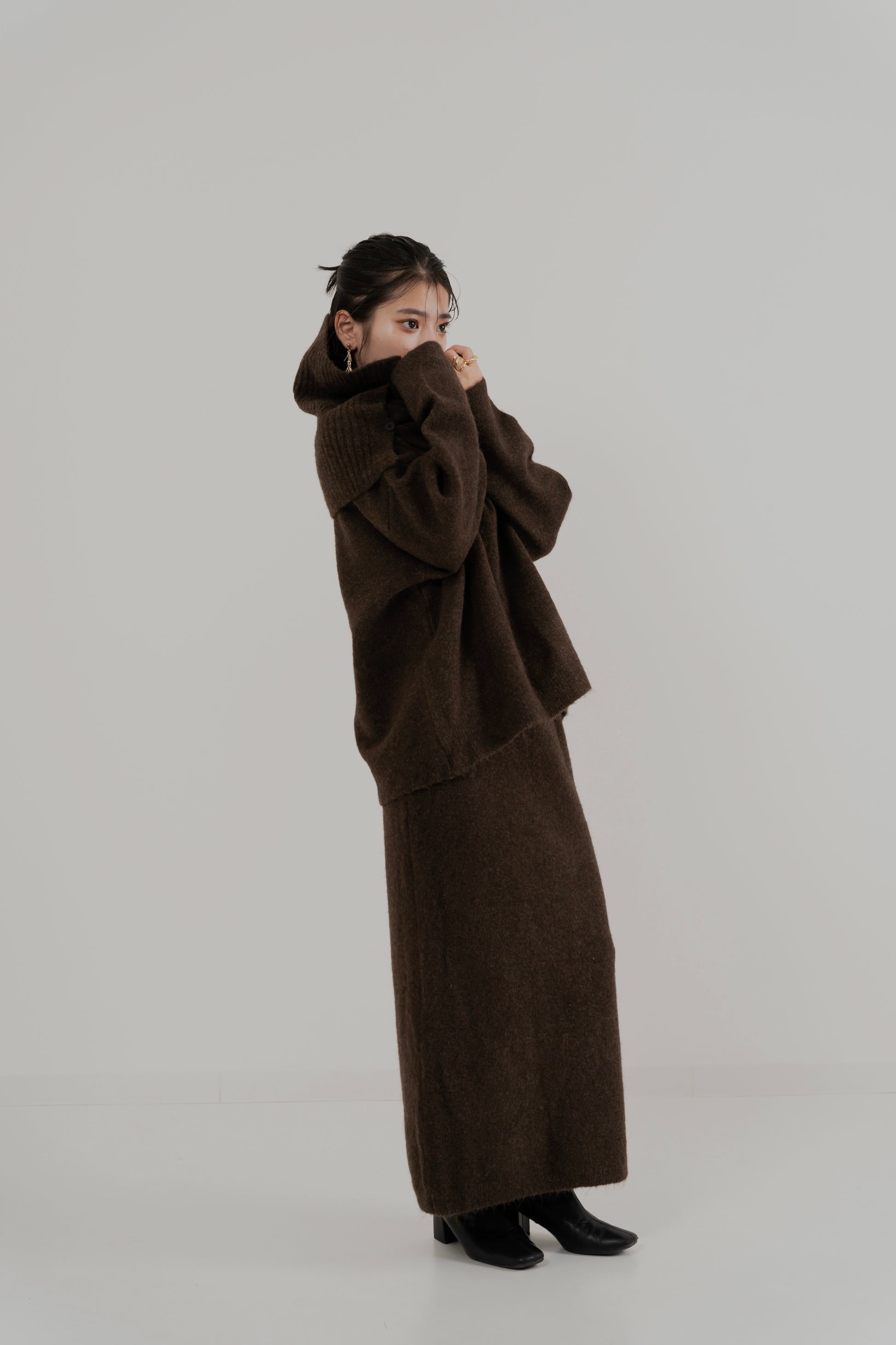 EVERIAらしいモードカジュアルを軸に、小柄な方でもバランスよく着こなせるニットセットアップ。トップスとロングスカートに加え、ボタンで取り外し可能なモダンスヌードを組み合わせた3ピース仕様。