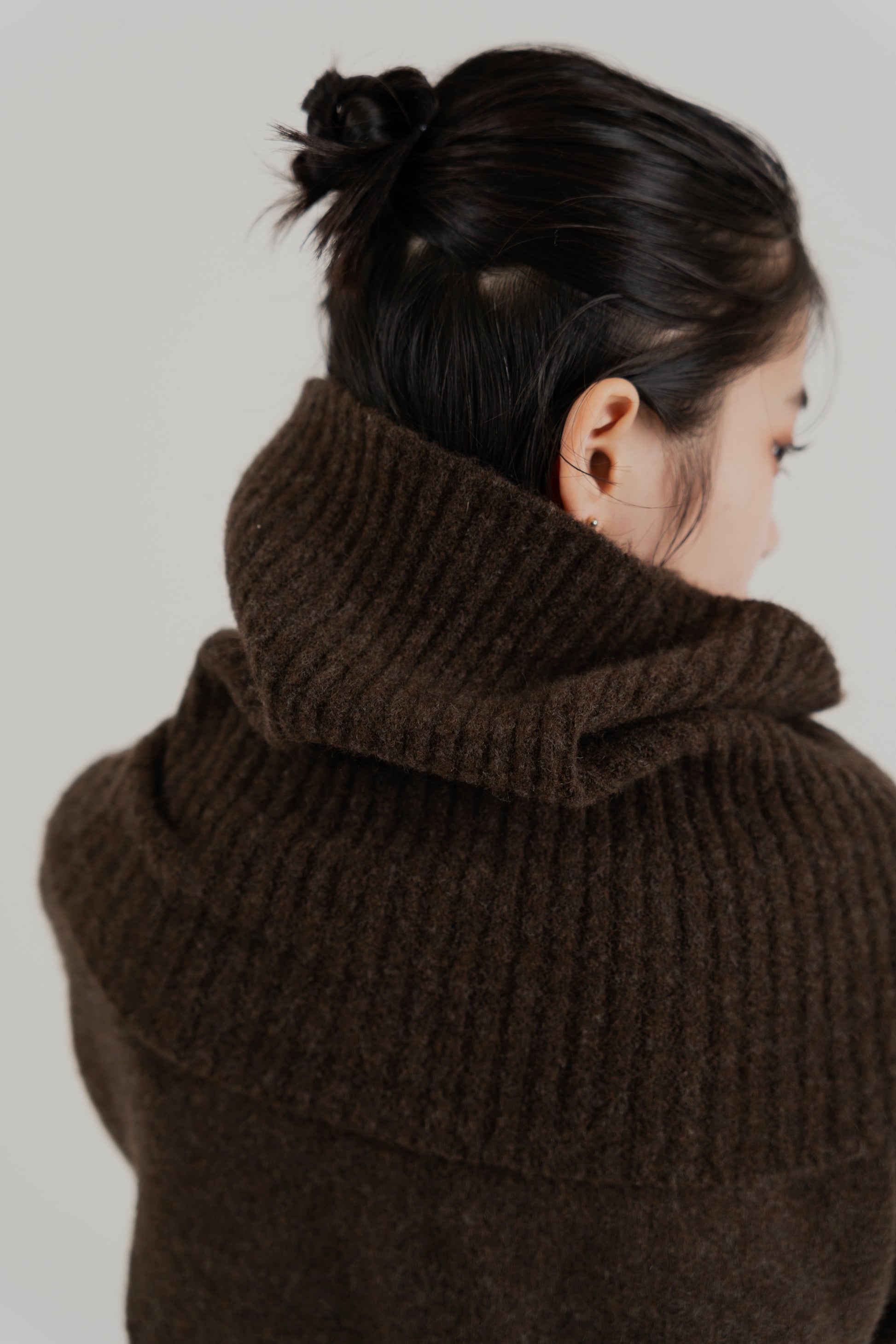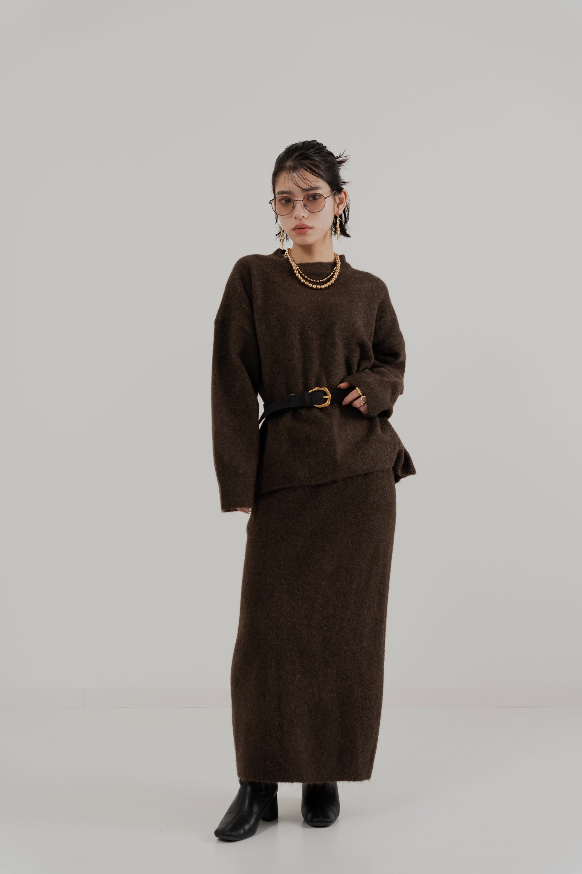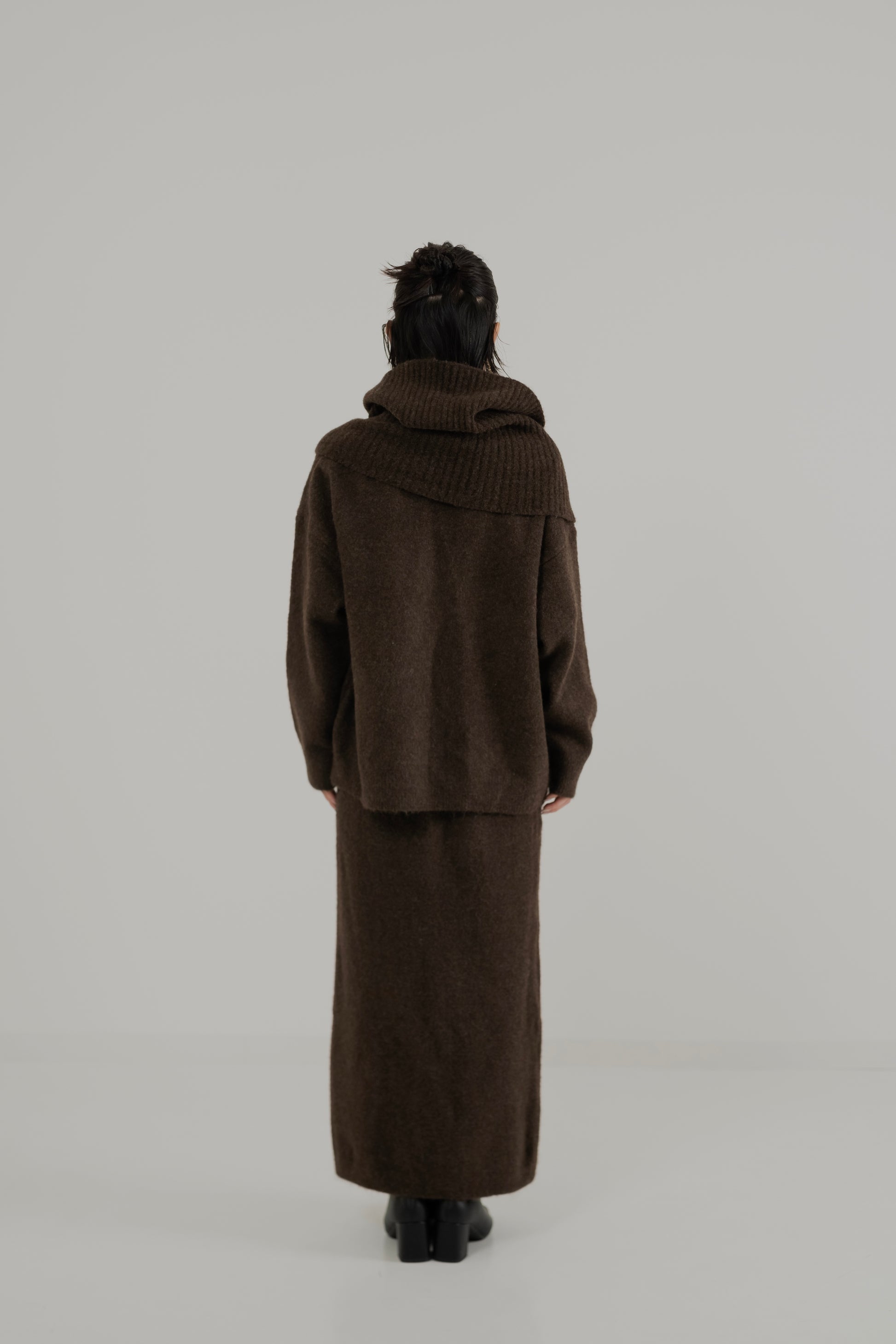 EVERIAらしいモードカジュアルを軸に、小柄な方でもバランスよく着こなせるニットセットアップ。トップスとロングスカートに加え、ボタンで取り外し可能なモダンスヌードを組み合わせた3ピース仕様。