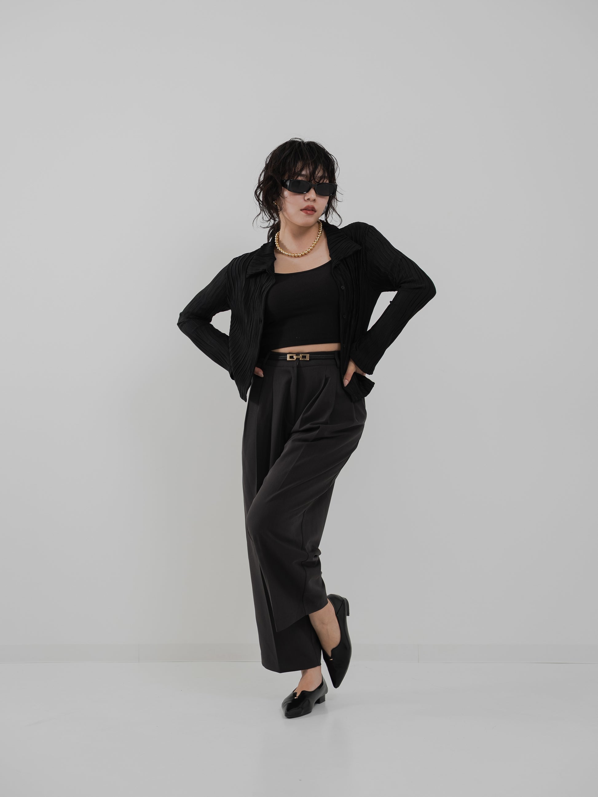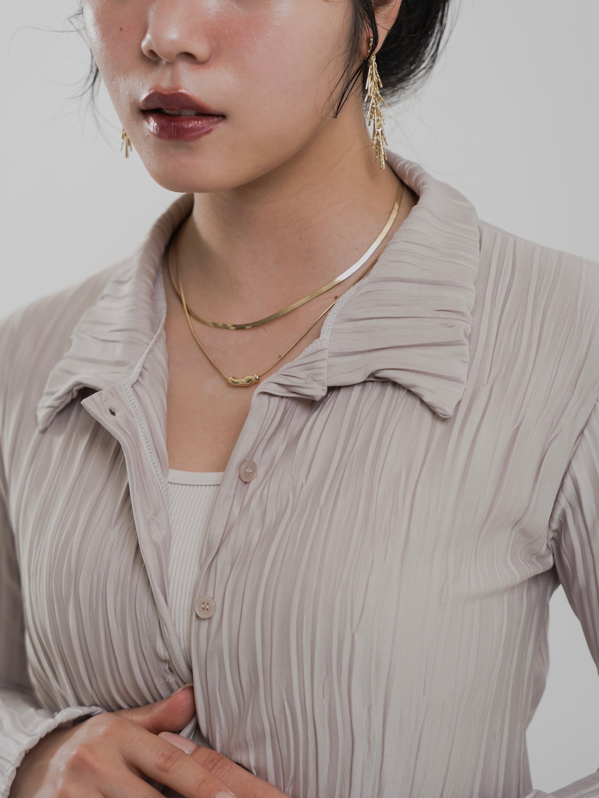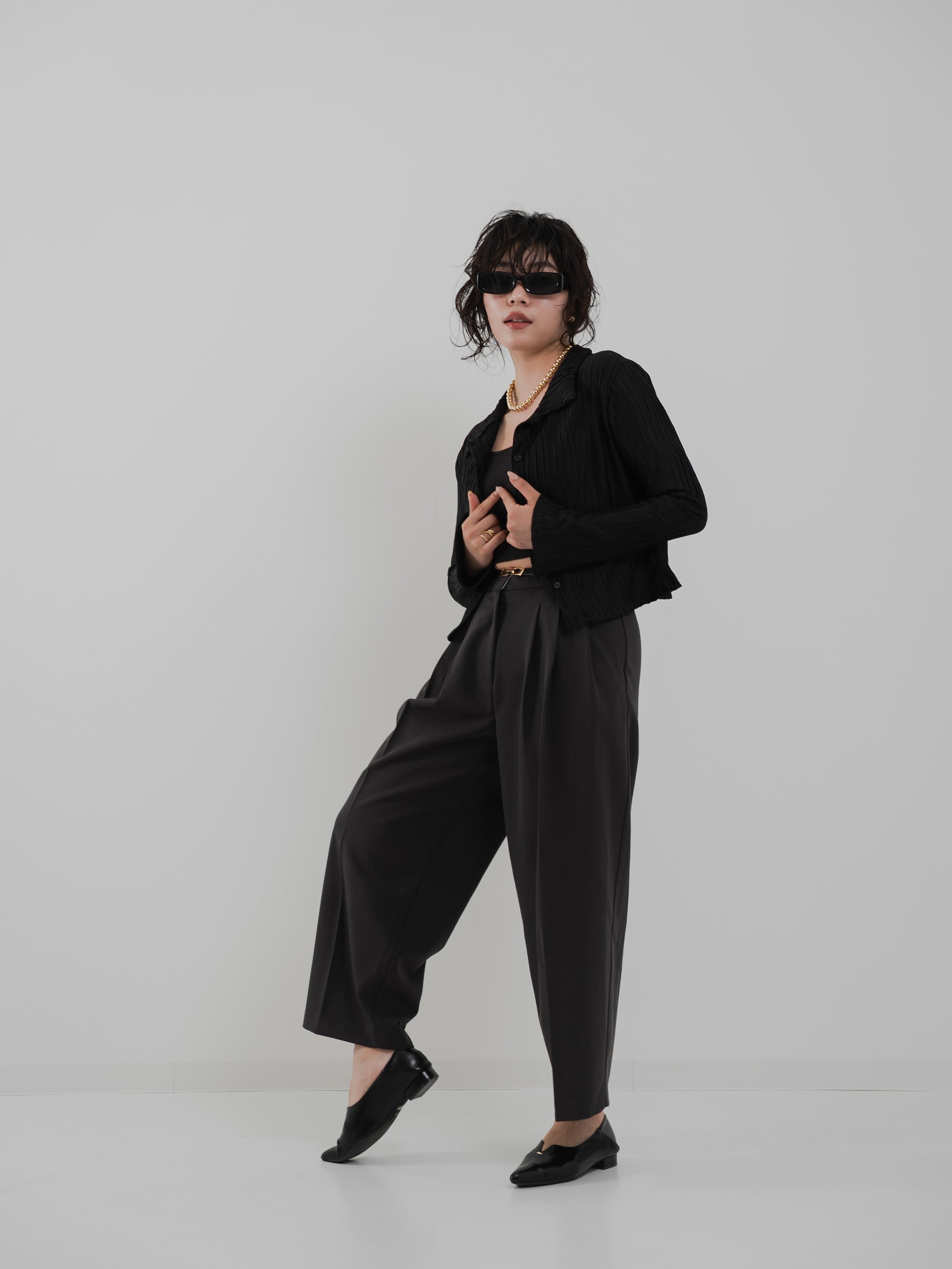 縦に流れるプリーツが、すっきりとした印象とモード感を演出。