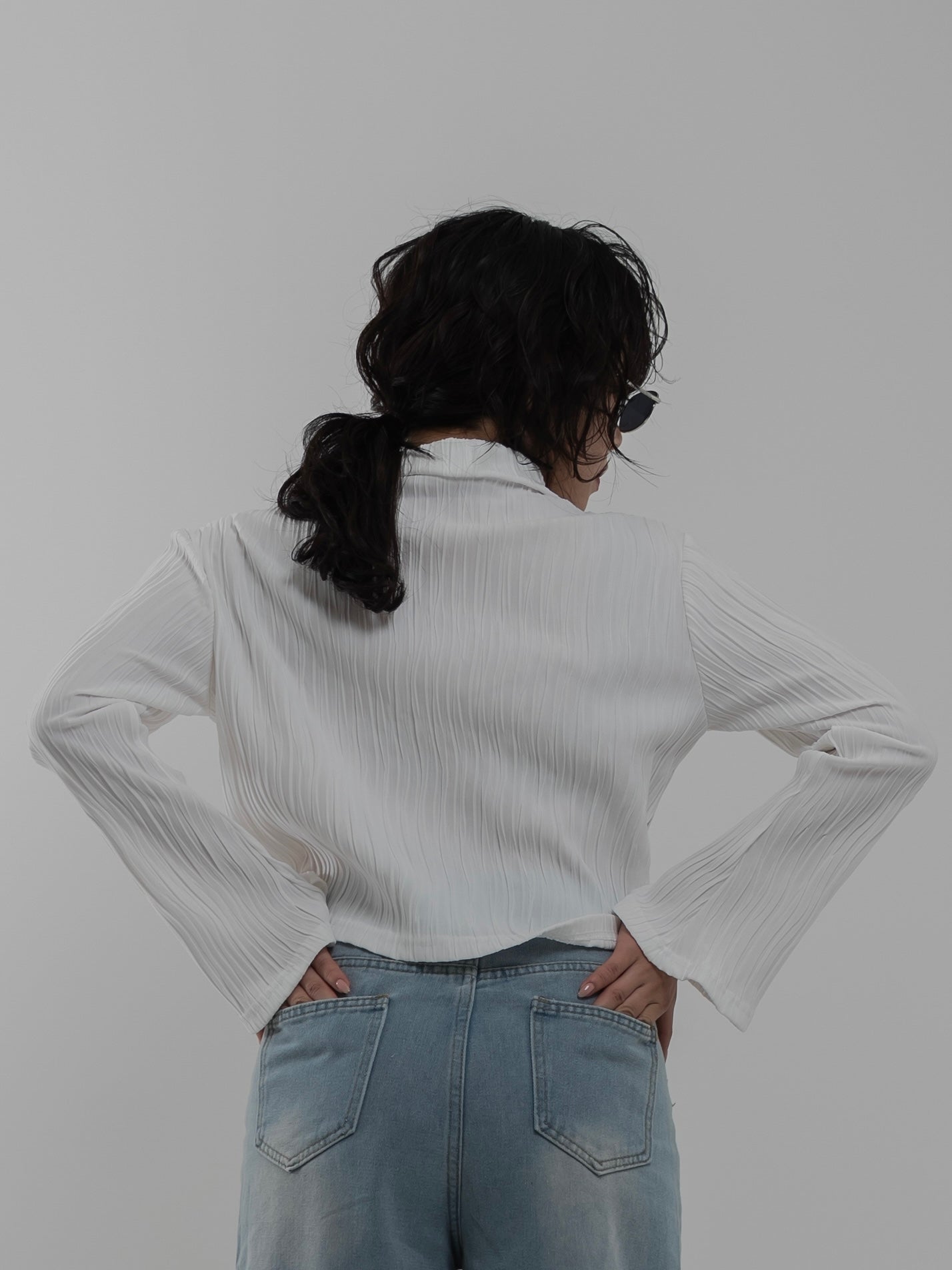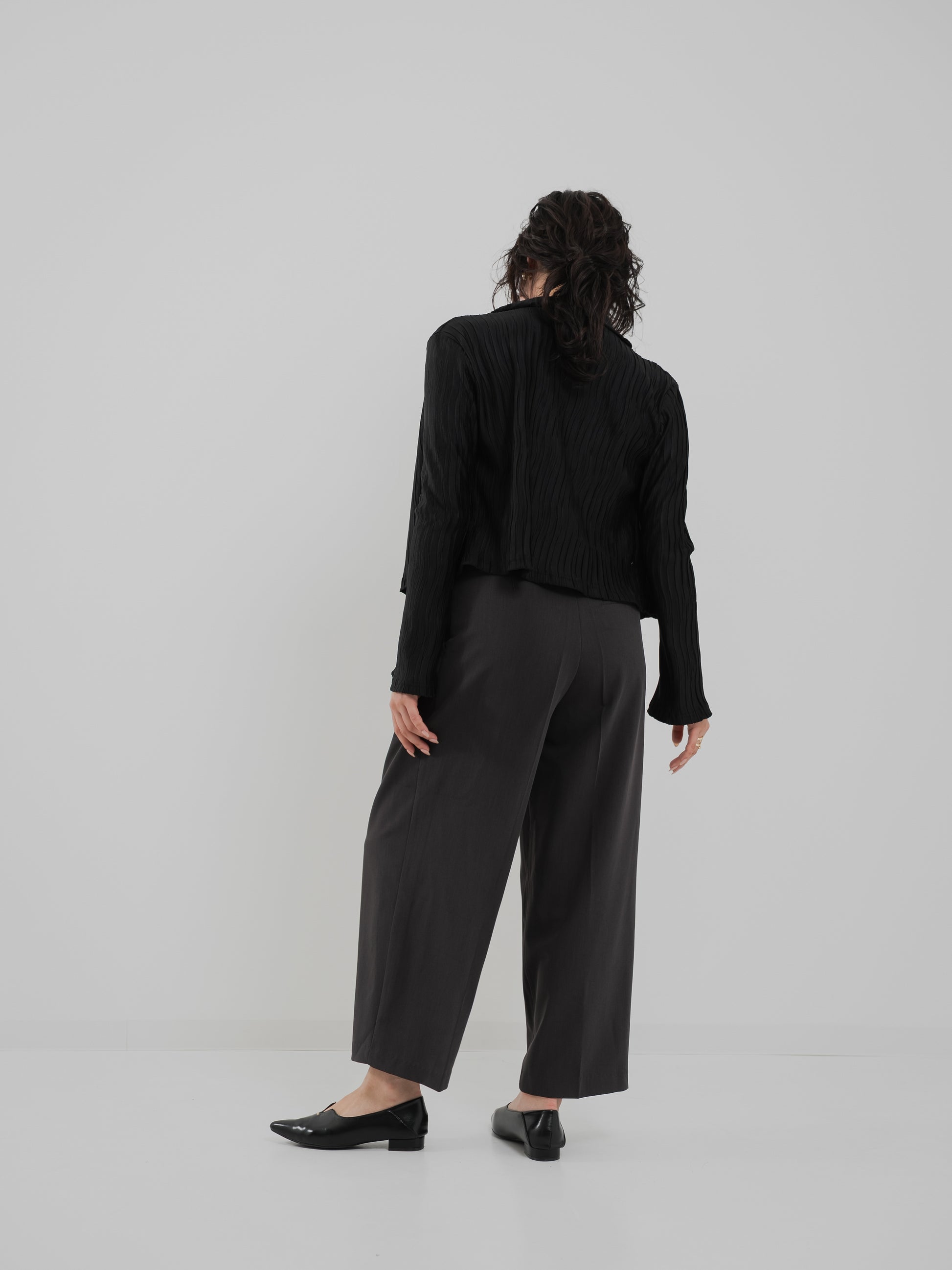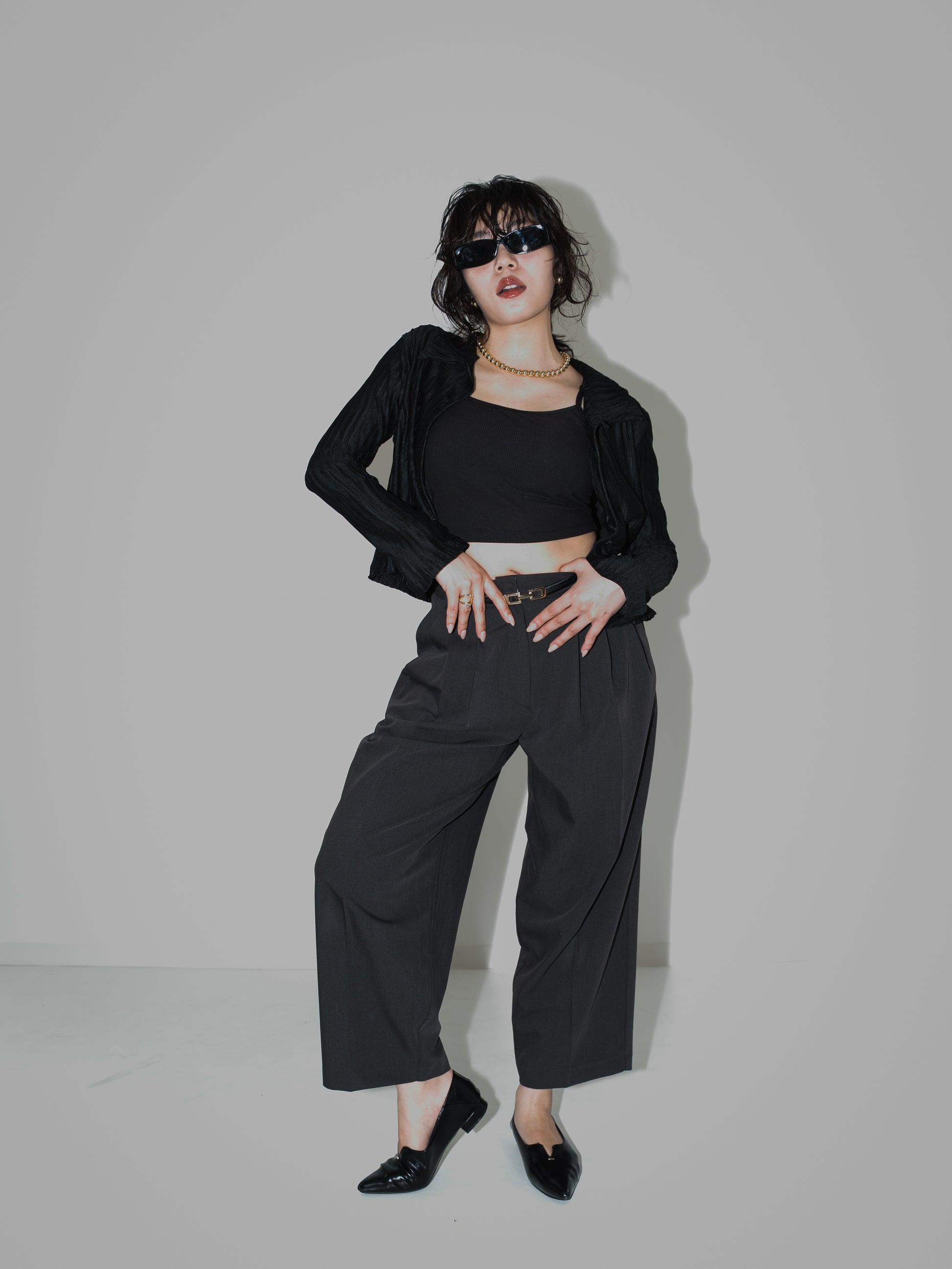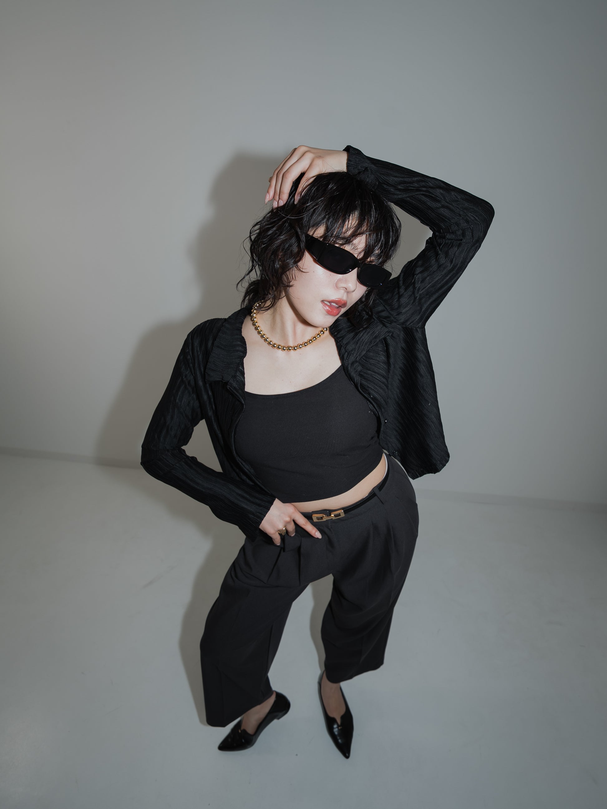 縦に流れるプリーツが、すっきりとした印象とモード感を演出。